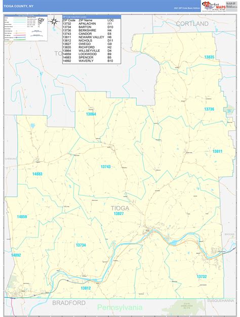 Tioga County, NY Zip Code Wall Map Basic Style by MarketMAPS MapSales